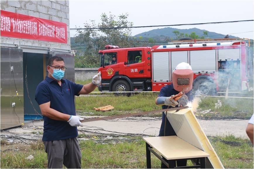 下午两时许,实验各项准备工作就绪,操作人员及记录人员就位,并根据实验方案要求逐一进行各个工况的操作,随着火源功率的增大,实验房间的火势越来越大,内部贴敷的保温材料也表现出变色、面板变形、芯材碳化等不同程度的破坏状态,系统化地呈现了不同火灾荷载及火灾功率对冷库内保温材料的影响。另一方面,电焊实验展示了电焊火花持续作用于内保温材料表面的情况,用于实验的材料出现变色、表面碳化的现象,但未发生明显燃烧,展示出离火自熄的特性。